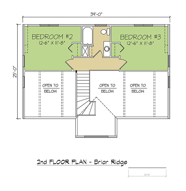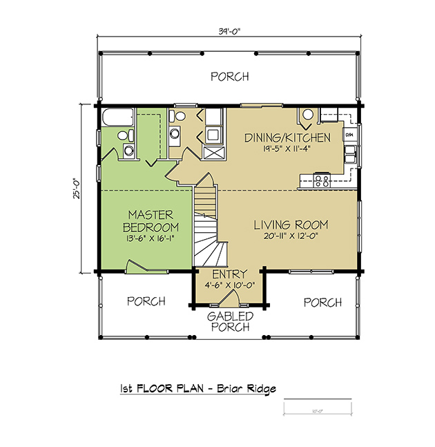 This cozy, small sized log cabin is planned for relaxation. The Briar Ridge offers a welcoming front Gabled porch, and a large Screened porch. The Living room has access to the Side porch and has an optional Corner fireplace. The adjoining Kitchen & Dining area is planned to allow placement of a large dining table for entertaining friends and family. This spacious main level is completed with two roomy bedrooms, a laundry closet and full bathroom with linen closet. The upper level has a large master suite with two Walk-in closets as well as a private bathroom with double vanities.
