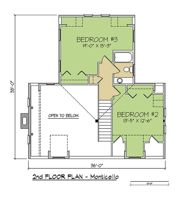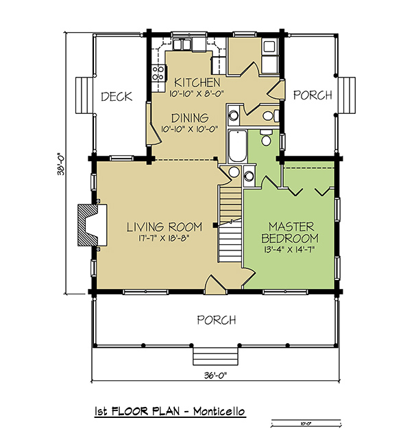 The Monticello is a perfect country cabin for a family get–together with it’s roomy front and side porches, optional stone fireplace and comfy frontier feel. Forget the office and overdue reports as you pack up the family and spend the weekend in the snow or sun (or the sack as you sleep until noon for the first time in weeks) - the choice is yours in the Monticello.